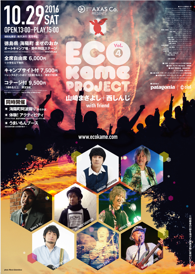 2010年より毎年開催されている、山崎まさよし、西慎嗣 with friendも今年で5回目となります。エコと自然へのリスペクトの意識喚起・向上を目的とした当イベントも今年は徳島県南部の海陽町の大自然の中で開催します。海と山に囲まれた「まぜのおかオートキャンプ場」での最高のロケーションの中で、より『自然』の素晴らしさと音楽が繋ぐ『人の出会い』の素晴らしさを共に実感しましょう。今年エコカメプロジェクトvol.2をイベントタイトルとしてビーチクリーンを実施し、イベント収益金の一部はウミガメ保護団体へ寄与されます。皆様のご参加を心よりお待ちしています。